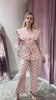 The ensemble is completed with a pair of high-waist straight pants, ideal for slimming the legs and lengthening the figure. Perfect for special events or elegant guest looks.